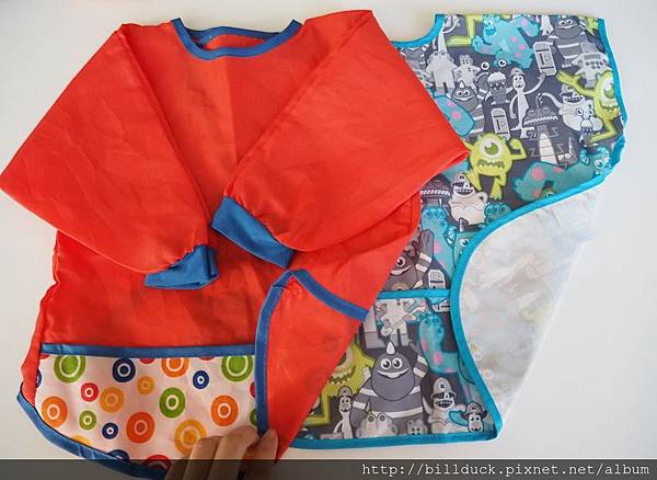 兩件都是防水材質,Ray比較小的時候對這種有點塑膠感的圍兜很排斥