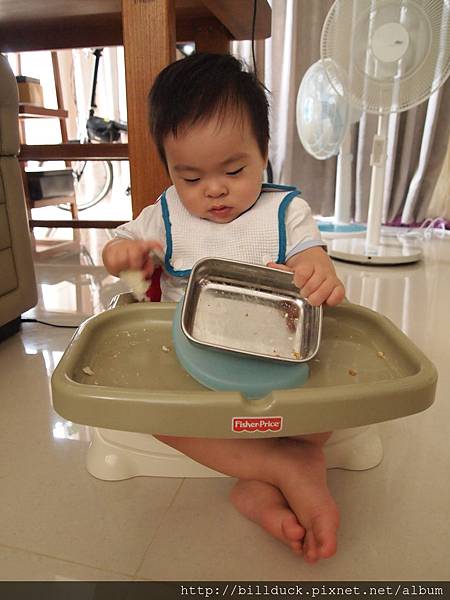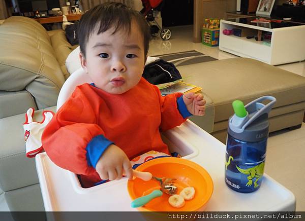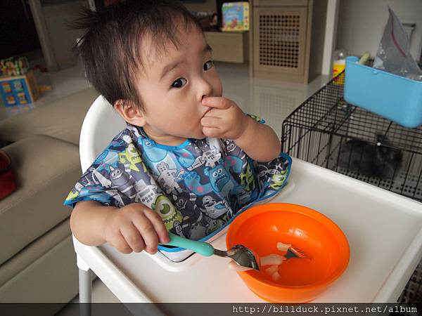 不過這個圍兜有時候Ray會想把它扯掉,或是不肯下面掛著接食物的口袋,有點可惜...