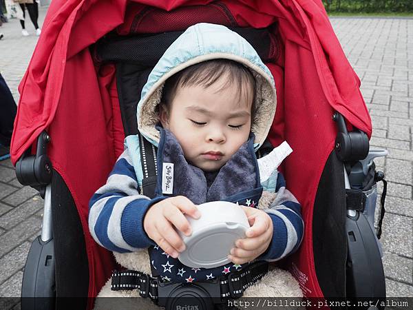 通常我都在外出Ray坐在推車上吃東西時給他戴著,
