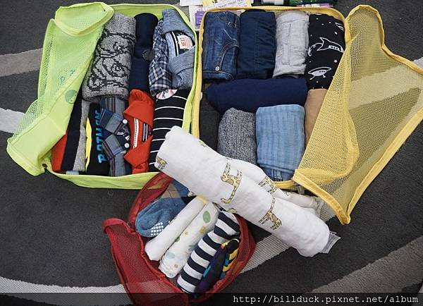 然後建議收在行李廂的時候用捲的,體積會比較小也可以一眼看清楚要拿哪一件,有收納袋的話可以收的比較整齊,小孩的衣物小小件,有個袋子裝比較不會散亂在行李廂內。