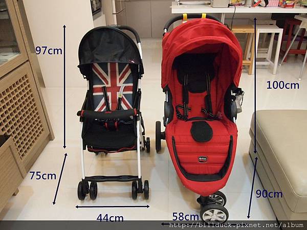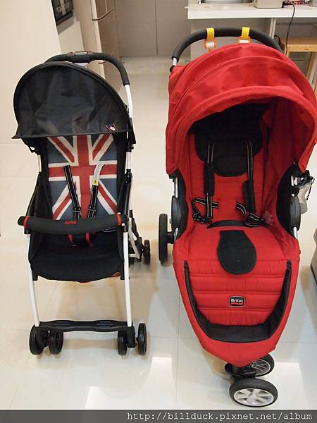這是Ray的兩台推車,左邊的是Aprica magical air plus 英國旗推車;右邊的是Britax b-agile三輪紅色推車